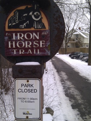 Many people have suggested that the trail should be lit at night, which is an obvious thing to do and which should have been done long ago. Most know that the Iron Horse Trail used to be a former railway, but it also used to an electric railway. So if you look carefully along the entire length of the IHT, you'll actually find hydro poles going all the way along. Adding lighting should not be a difficult proposition.
