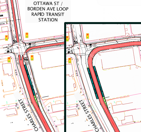 Current plans have stations at Ottawa/Mill, Ottawa/Charles, and Borden/Charles. To run the LRT both ways on Borden, all that will change is moving the northbound Ottawa/Charles stop 150m up Charles St to Borden. Without the LRT turning from Ottawa onto the rail corridor, the Ottawa/Mill stop can now be located directly at Ottawa St, instead of being 50m south of the road (pg 4). How does this affect transfers?