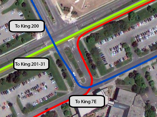 Those traveling to the high-rise housing centred at King and Hickory would be equally served by any of the bus routes here, but must choose between one of three different bus stops. The 7E will take them closest, but only runs every half hour. The 31 and 201 gets you to King and Columbia, a short walk away, but the buses are only every 15 minutes and often leave simultaneously. The 200 is every 10 minutes, but requires the longest walk at the other end. None of these are clearly preferable. This serves to either crowd the 200 iXpress, or force people to rely on schedules despite buses on average every 6 minutes.