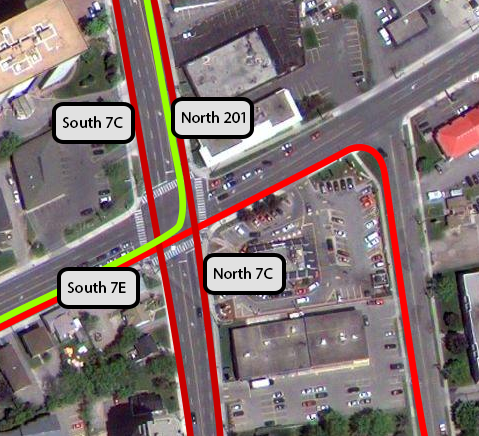 Here, there are stops on opposite sides of Columbia for those wishing to go north to Conestoga Mall. To catch the 201, the stop is on the north, to catch the 7C, the stop is on the south. Better service to the mall would be served with both stops on the north side. Similarly, for those going to Uptown, the 7C stops on the north side of Columbia, while the 7E stops on the south side. These are both route 7 buses, but they do not share a common stop until they reach University Ave.