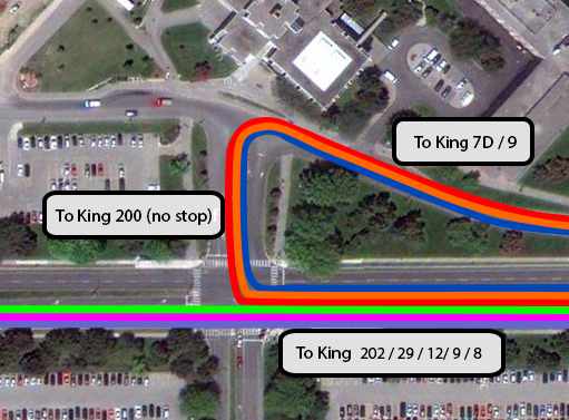 To get to the node at King and University, one can choose either to wait for a half-hourly 7D, or cross the street, and catch the much more frequent University buses. Curiously, the 9 stops at both South Campus as well as University and Seagram, while the 7D does not. Those headed to Uptown must choose to either wait for the 7D, or take a frequent bus to King and University and transfer to a 7C. Picking the wrong stop results in watching equally acceptable options pass by. Consolidating all stops to Seagram and University would eliminate any question of where is best to catch a bus.