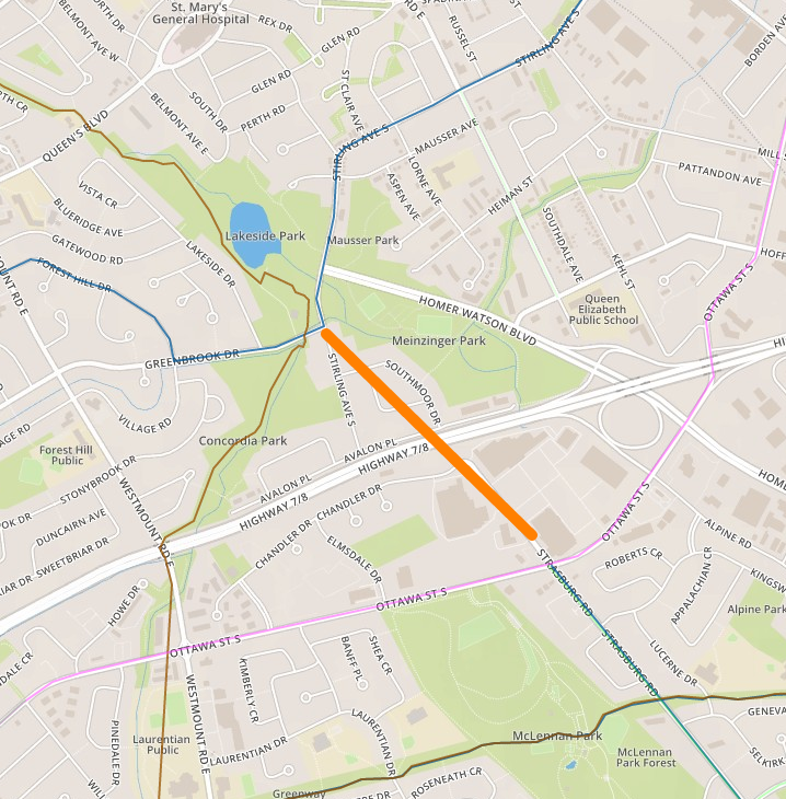 The loss of the Avalon/Southmoor loop has prompted a feasibility study for an active transportation bridge across Highway 7/8 at Chandler Drive to enable the neighbourhood access to route 3 and the Laurentian Power Centre. Such a connection would have an enormous impact on the walking and cycling access for the area - it would link the Lakeside Trail and proposed Stirling/Forest Hill bike route to the north with the Strasburg bike lanes, the McClennan Park trails, and the soon-to-be-constructed multi-use paths along Ottawa. It would help to alleviate the profound shortage of good highway crossings for pedestrians and bikes in the area.
