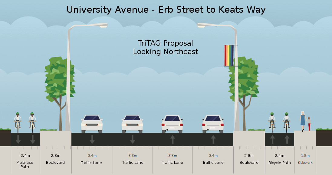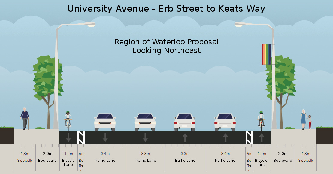 In our last post, we raised some concerns with the Region's recommended design for the reconstruction of University Avenue between Erb Street and Keats Way. In particular we have issues with the inadequate separation from motor traffic, and the ability to maintain the lanes in winter. Here is a quick overview of a design that we believe better addresses these issues.