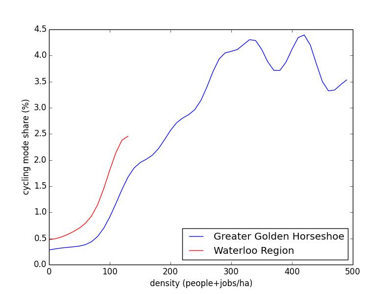 Cycling mode share vs density in Waterloo Region and the Greater Golden Horseshoe. As density increases, the percentage of people who bike increases by an order of magnitude. Data source: 2011 Transportation for Tomorrow Survey, Data Management Group.