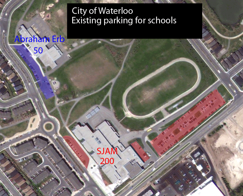 If Sir John A. Macdonald Secondary School and Abraham Erb Public School were built under the proposed zoning bylaw, they’d have to build over 3 times as much parking as they currently have.