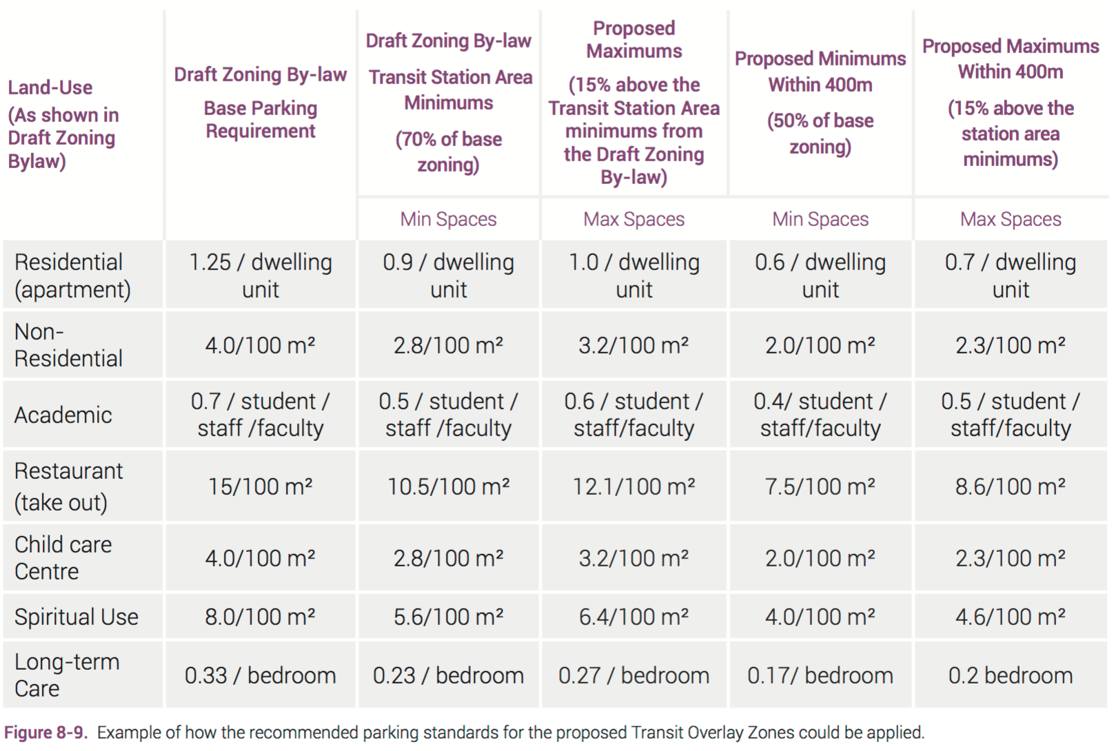 The draft plan suggests altering Waterloo's draft zoning bylaw requirements for station areas in two important ways. The first is to impose a parking maximum of 15% above the minimums. The second is to apply increased parking reductions of 50% within 400 m of stations, and allow buildings within this radius to maintain parking on sites outside.