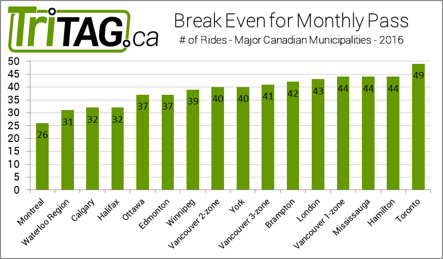 The number of bus rides for a monthly pass to be cheaper than tickets across several Canadian municipalities[/caption]As we mentioned in our last post, over the last 10 years the GRT monthly pass has dropped from 38 to 31 rides per month to pay off the cost of the pass, making Waterloo Region second only to Montreal's 26. At the other end of the chart, Toronto's Metropass needs a staggering 49 rides to break even, meaning taking transit to work every day in addition to multiple extra trips. Largely, most cities have settled around 40 rides, which is just shy of the monthly average of 42 trips someone working 5 days a week will make.