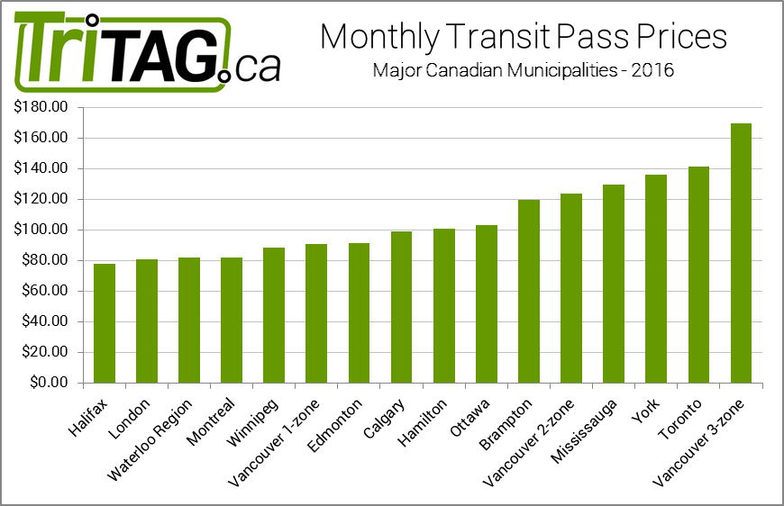Monthly transit pass prices in various Canadian municipalities in 2016Comparing monthly passes, the chart is dominated by incredibly pricey Toronto and Vancouver passes, with the GTA cities close behind.