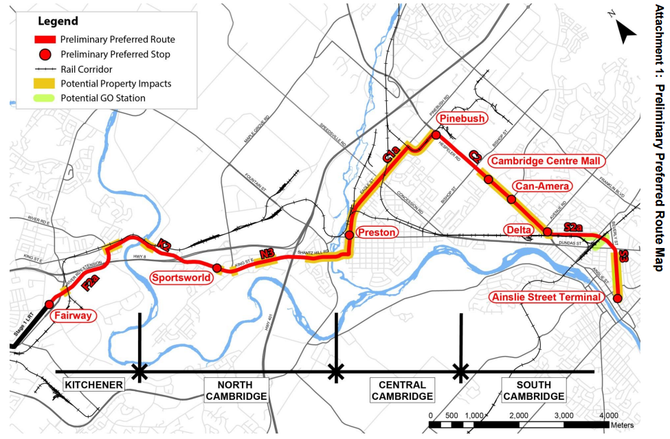 Regional staff have revealed their preliminary preferred route for ION light rail stage 2 through Cambridge. Route would use River Road extension to cross Highway 8, follow Shantz Hill to Preston, avoid the Hespeler/Pinebush intersection by using a freight bypass to cut the corner, and follow the rail corridor and Beverley instead of Water to better facilitate future connections with GO trains. Consultations will be held Feb 23, 28, and March 1, and online feedback can be shared until March 17.
