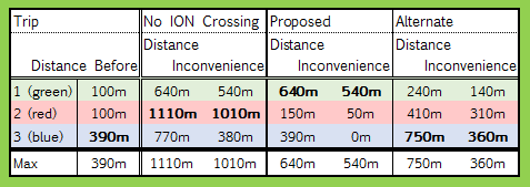 The alternate crossing we propose, at 652 Fairway, has the lowest Trip of maximum Inconvenience, only causing trip 3 an additional 360m walk. The trip is 110m longer than trip 1 under the previous scenario, but the additional walk, compared to before ION construction, is much less.