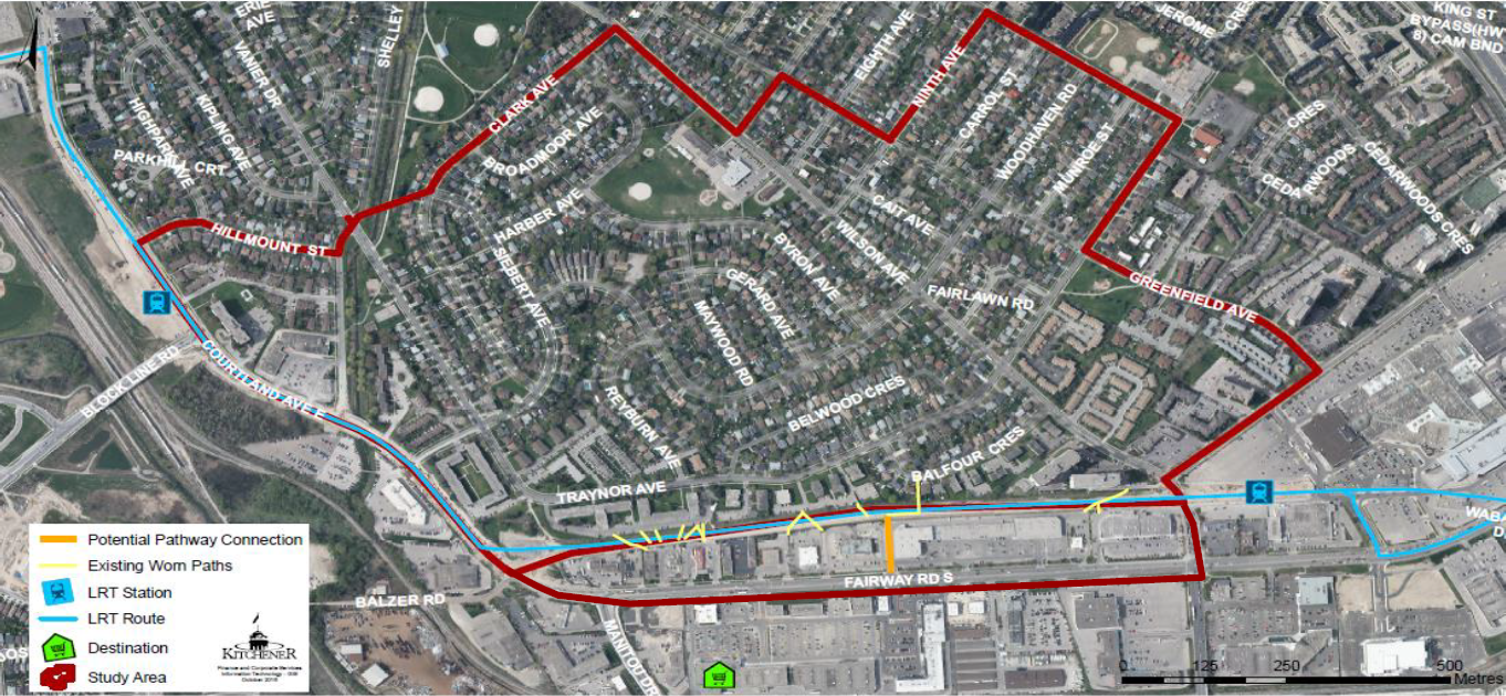 - Walking distance after ION, with a crossing as proposed at 500-560 Fairway (Swiss Chalet)