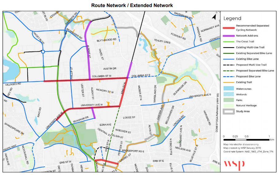 It is disappointing that the proposed network is somewhat scaled back from an earlier vision staff were considering last year. These reductions are now listed on the map as "add-on extensions." Dithering and delays (the pilot was supposed to have been built in 2018) have cost the Region support from a provincial government no longer interested in funding cycling infrastructure. The Albert Street extensions fall under City of Waterloo jurisdiction (staff hope to coordinate with the city to grow the pilot on their end). The King Street extension north of Columbia, which would provide vital connectivity to the multi-use paths between Weber and Conestoga Mall, is dismissed because staff value higher motorized traffic volumes over cycling along that corridor.