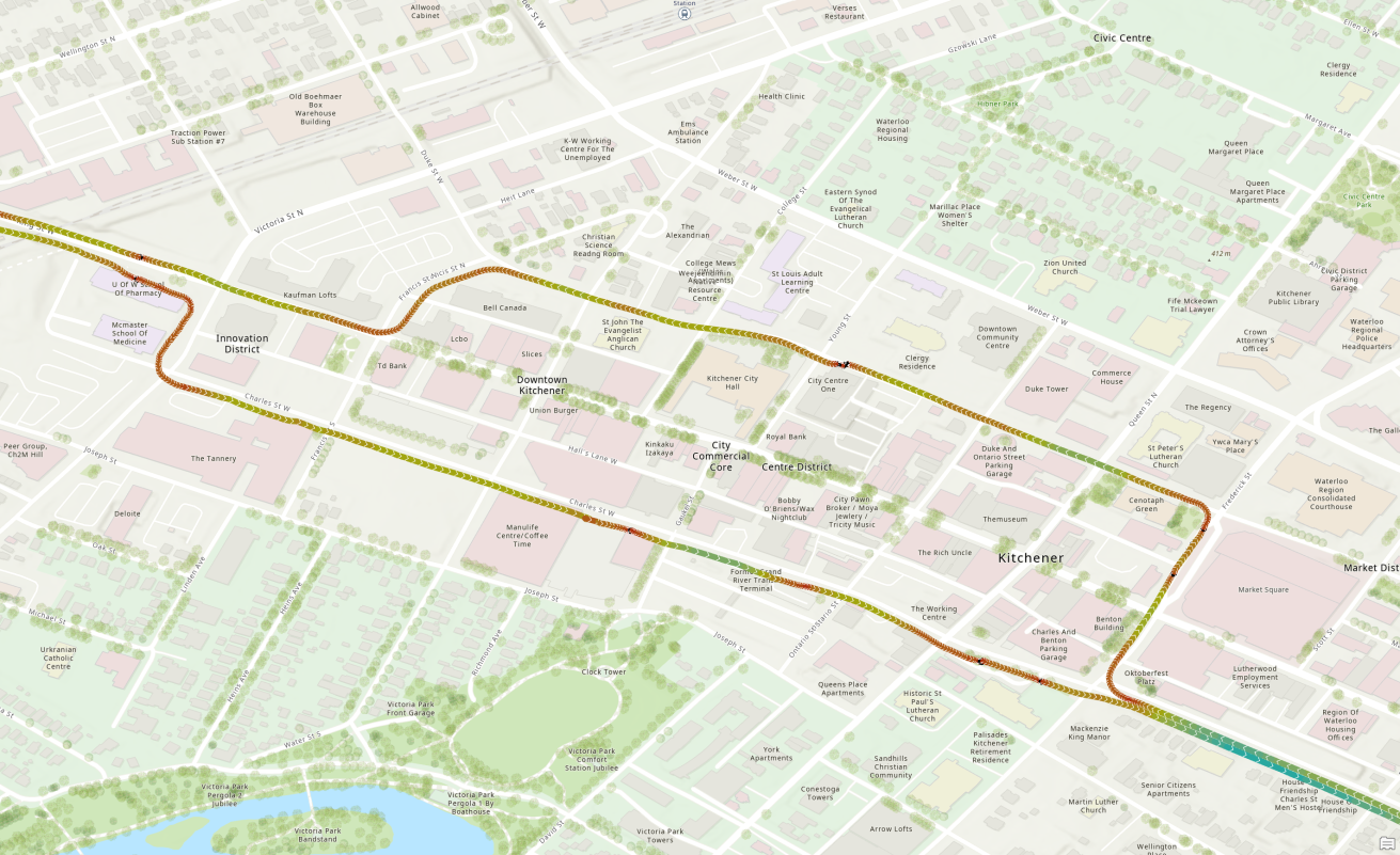 For example, when leaving Kitchener City Hall Station, trains often creep forward a few metres, then sit waiting for a traffic signal to change. Our speed profile analysis shows that signal priority does not always activate quickly enough, especially in the street-running sections of Downtown Kitchener. If trains received stronger “absolute” signal priority after leaving stations, much of this waiting could be eliminated. This would help ION better match car travel times in the urban core, where its speeds are currently the lowest.